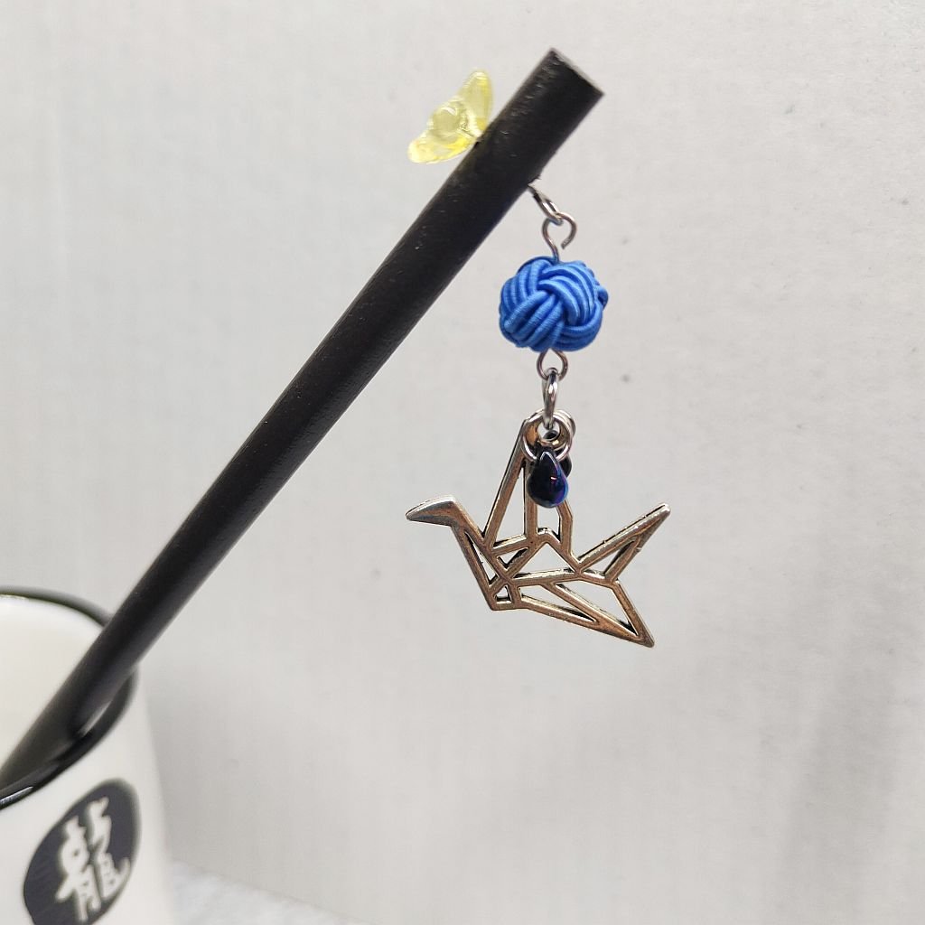 Jehlice je ozdobená mizuhiki uzlem tama-musubi, přívěskem origami jeřába a skleněným kapičkami.