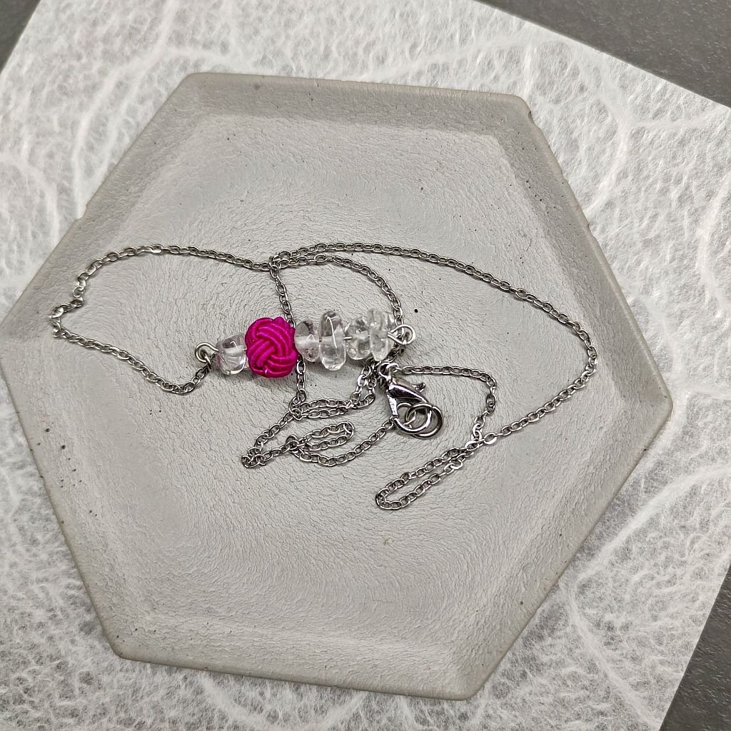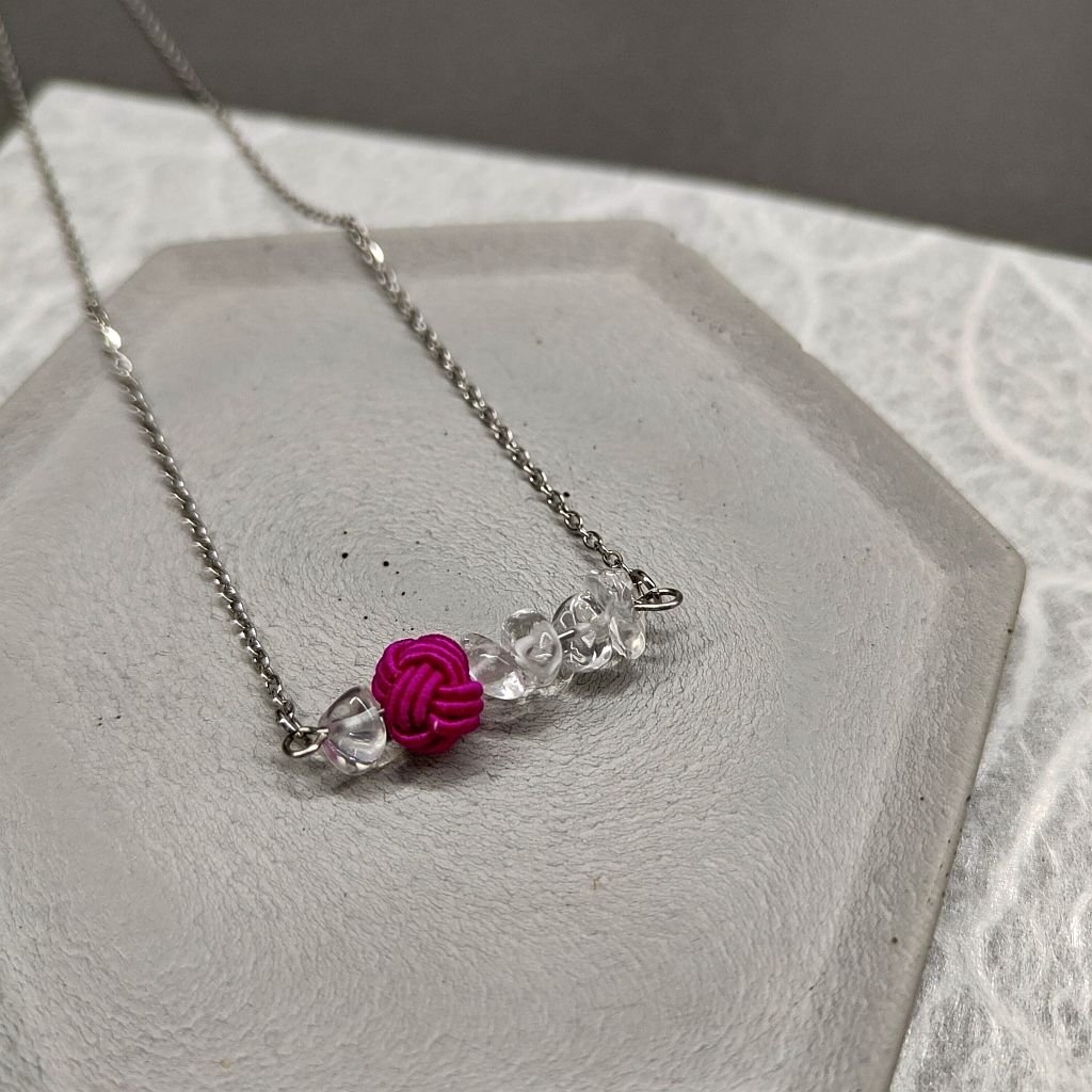 Elegantní náhrdelník kombinující mizuhiki uzel a přírodní křišťál. Řetízek je z nerezové oceli s malou karabinkou.