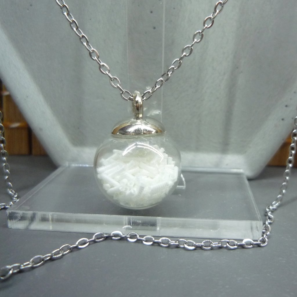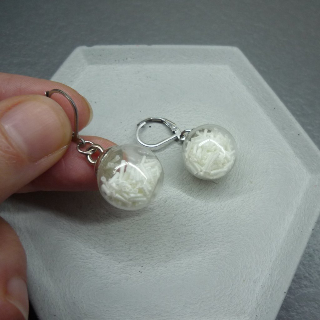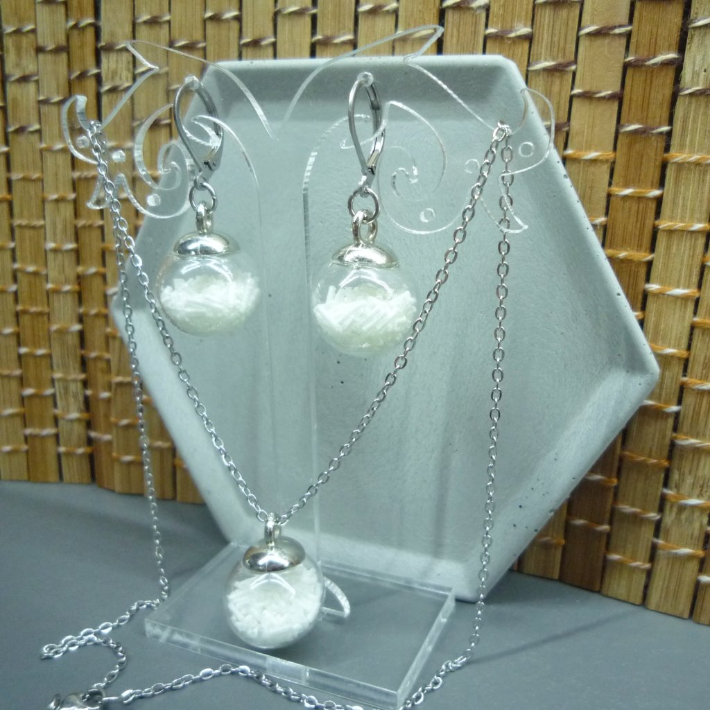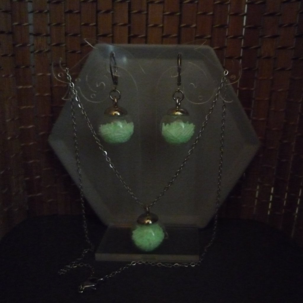 Skleněná mini baňka je naplněna kousky šlahounů ShuCODE, které jsem nastříhala ze zbytků po výrobě bezpečnostní kolekce reflexních přívěsků BeSafe (model 2023). Šlahoun je fluorescenční, tj. po nasvícení ve tmě zelenkavě světélkuje. Jedná se tedy o upcycling a je k dispozici pouze 1 set (náušnice a náhrdelník).