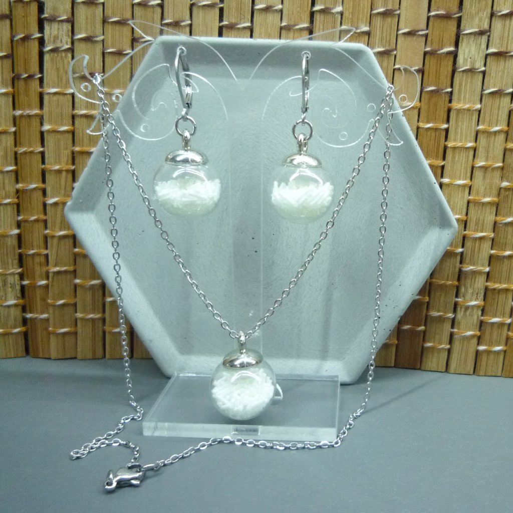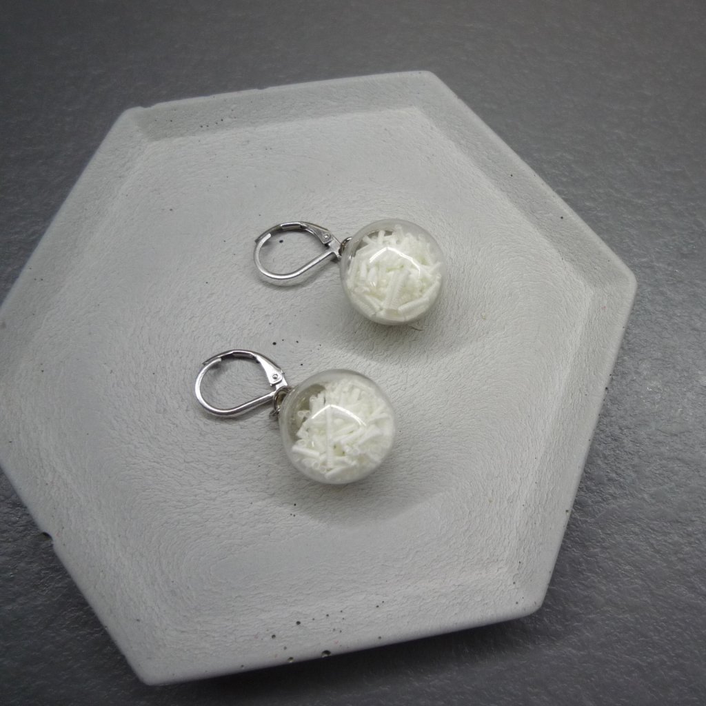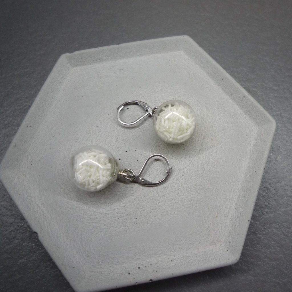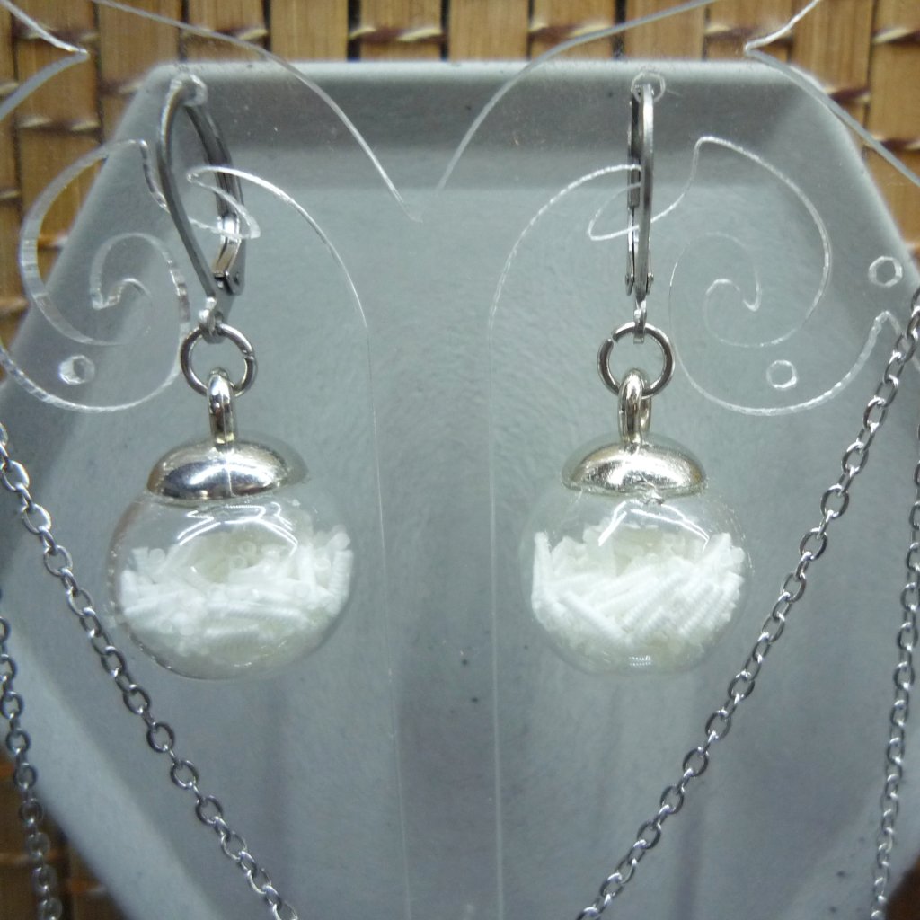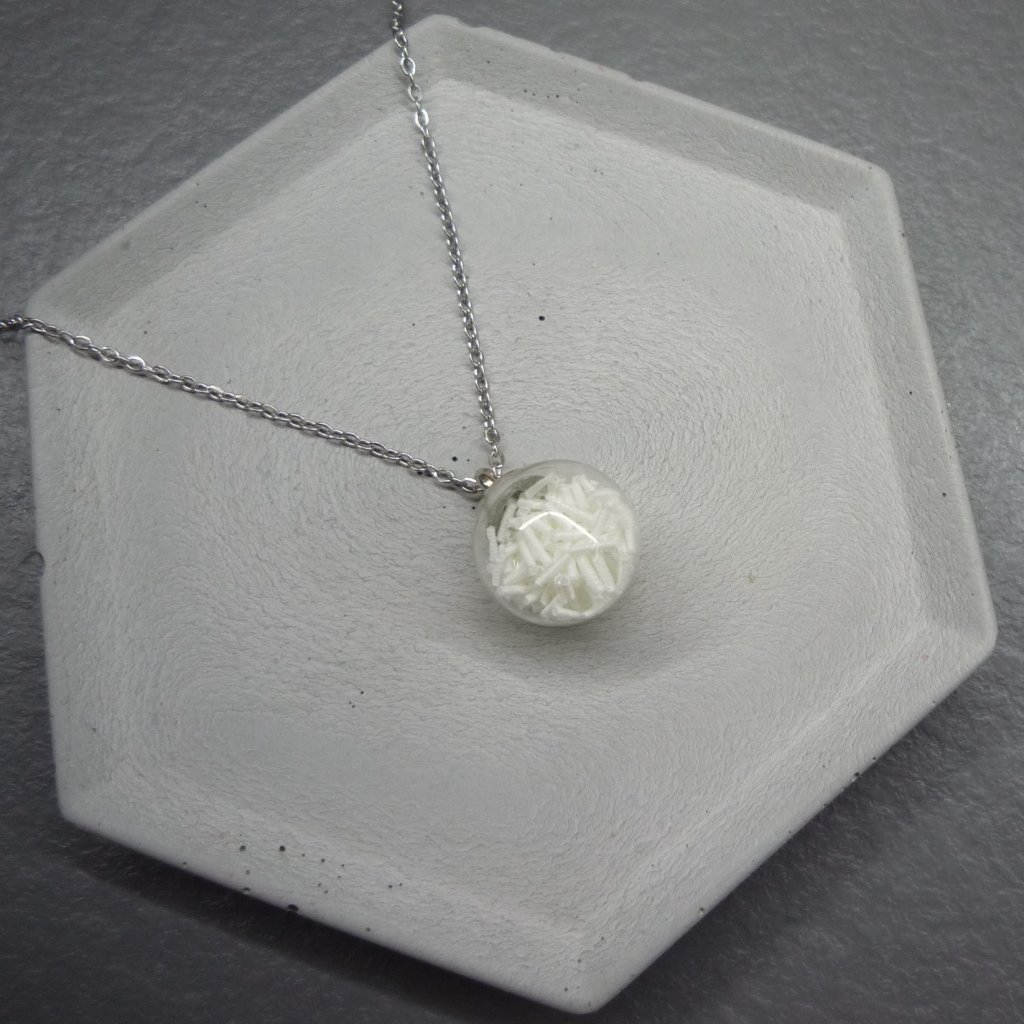 Skleněná mini baňka je naplněna kousky šlahounů ShuCODE, které jsem nastříhala ze zbytků po výrobě bezpečnostní kolekce reflexních přívěsků BeSafe (model 2023). Šlahoun je fluorescenční, tj. po nasvícení ve tmě zelenkavě světélkuje. Jedná se tedy o upcycling a je k dispozici pouze 1 set (náušnice a náhrdelník).