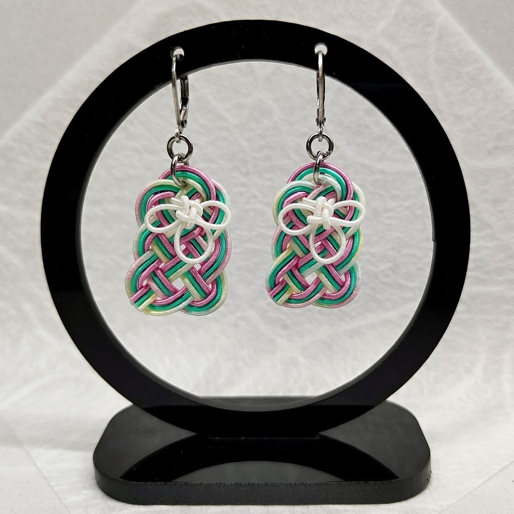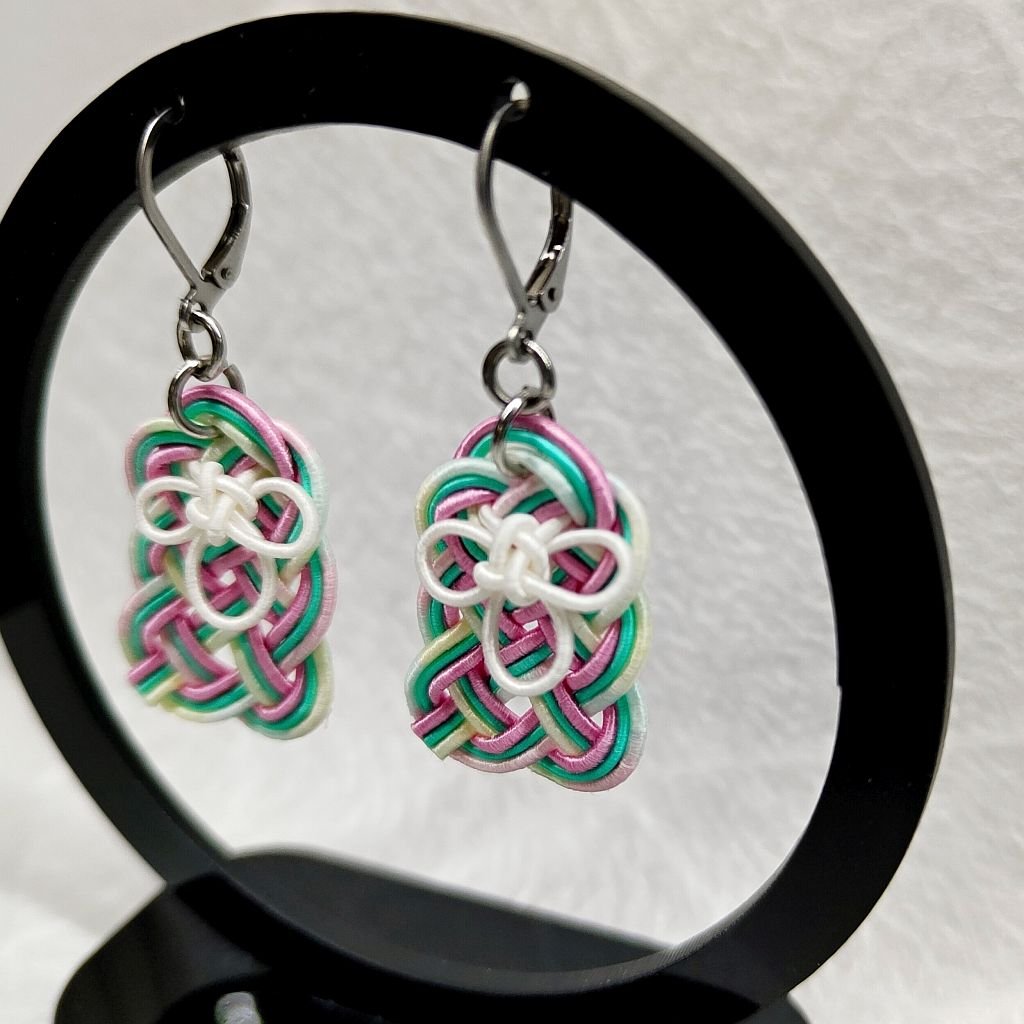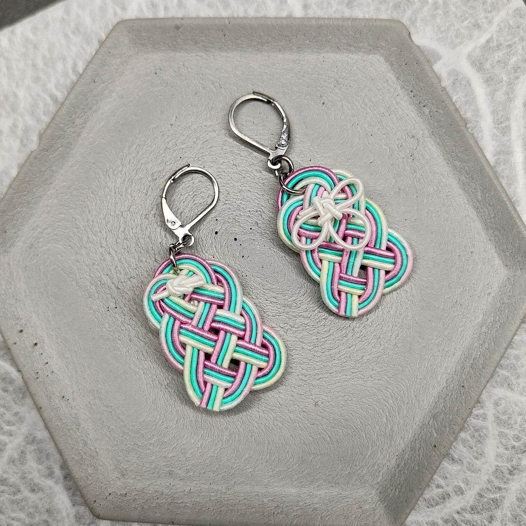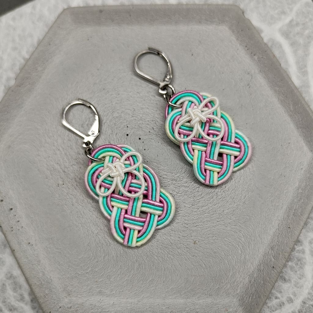 Jedná se o tradiční japonskou techniku mizuhiki, což je vázání uzlů ze speciálních papírových šlahounů. Díky použitému materiálu jsou náušnice lehké a odolné i vůči vodě. Nevadí tak, když si náušnice zapomenete sundat před koupelí.