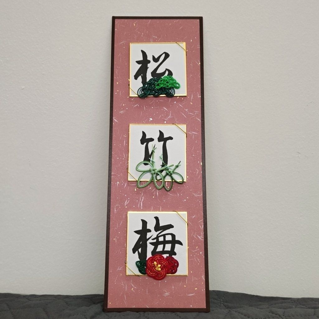 Kombinace tradičních japonských umění - kaligrafie a mizuhiki v rámci obrazu na motiv "Tři přátelé zimy - Borovice, Bambus a Slivoň".