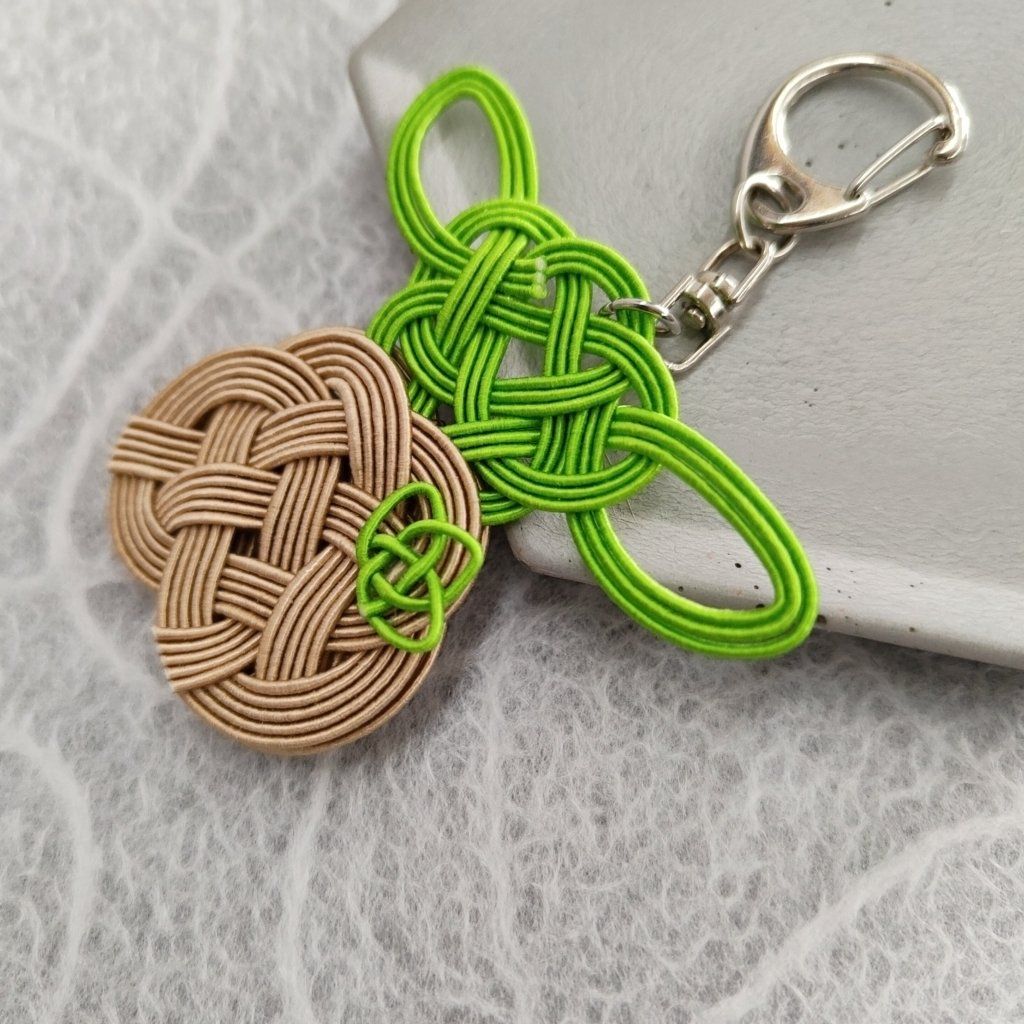 Jedná se o tradiční japonskou techniku mizuhiki, což je vázání uzlů ze speciálních papírových šlahounů. Díky použitému materiálu je přívěsek lehký a odolný i vůči vodě.