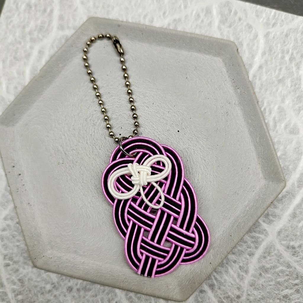 Jedná se o tradiční japonskou techniku mizuhiki, což je vázání uzlů ze speciálních papírových šlahounů. Díky použitému materiálu je přívěsek lehký a odolný i vůči vodě.