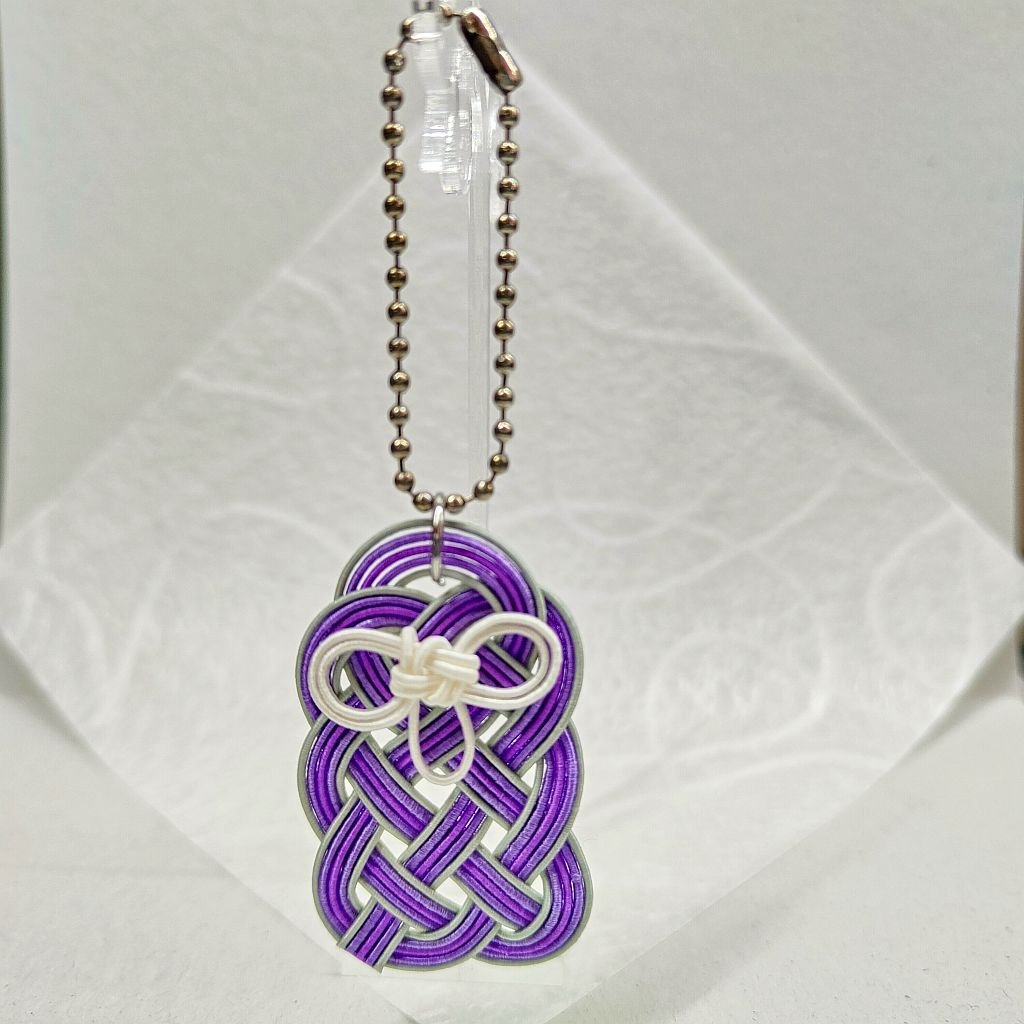 Jedná se o tradiční japonskou techniku mizuhiki, což je vázání uzlů ze speciálních papírových šlahounů. Díky použitému materiálu je přívěsek lehký a odolný i vůči vodě.