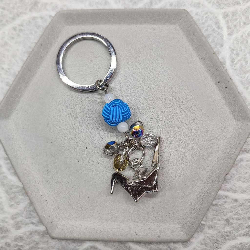 Jedná se o tradiční japonskou techniku mizuhiki, což je vázání uzlů ze speciálních papírových šlahounů. Díky použitému materiálu je přívěsek lehký a odolný i vůči vodě.